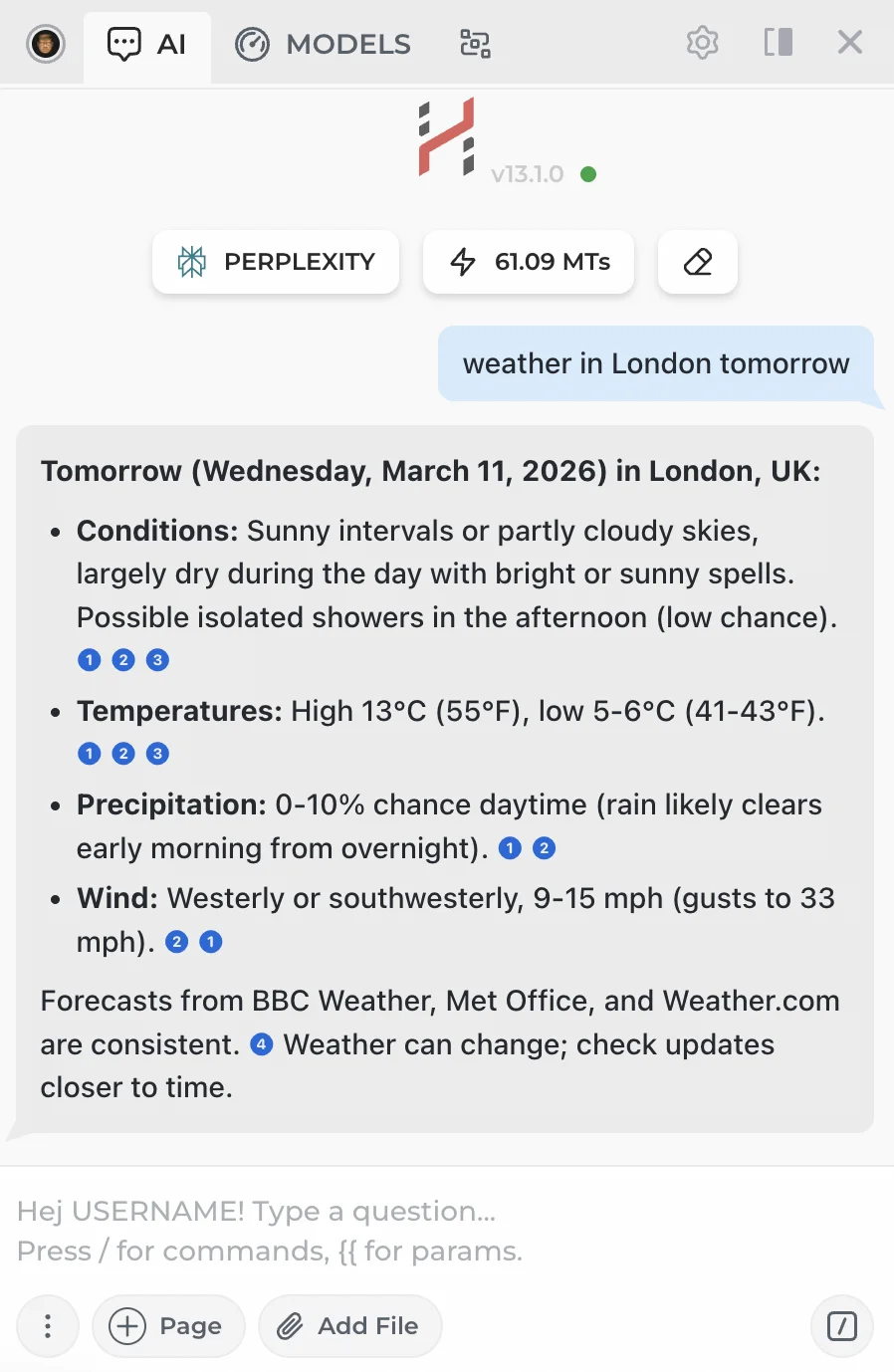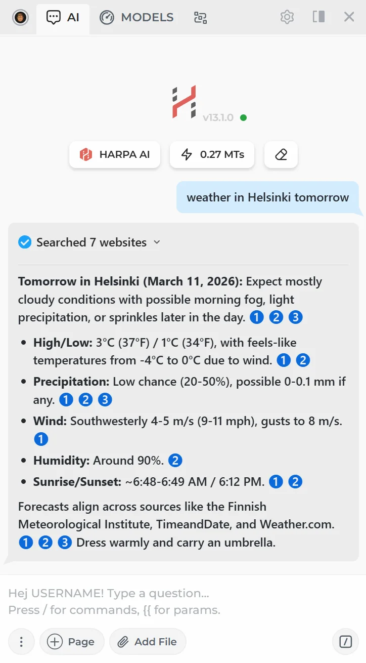 Perplexity connections return AI responses with inline links to web sources. They are a solid alternative to HARPA AI Web Search, but cost significantly more Megatokens.