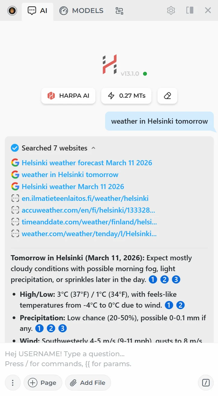 The default HARPA AI CloudGPT connection comes with built-in automatic web search. When the AI needs up-to-date information, it searches the web on its own — no extra setup required.