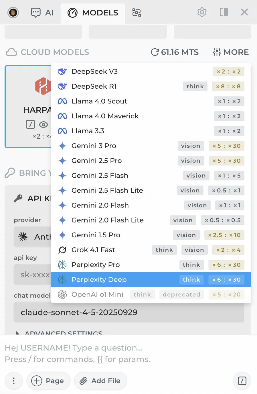 Open the model menu in HARPA, find the CLOUD MODELS section and click + to add Perplexity Pro or Perplexity Deep connections included in your HARPA AI S plan.