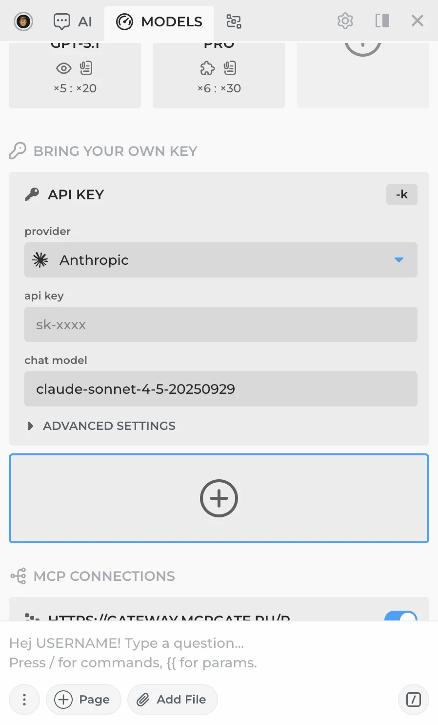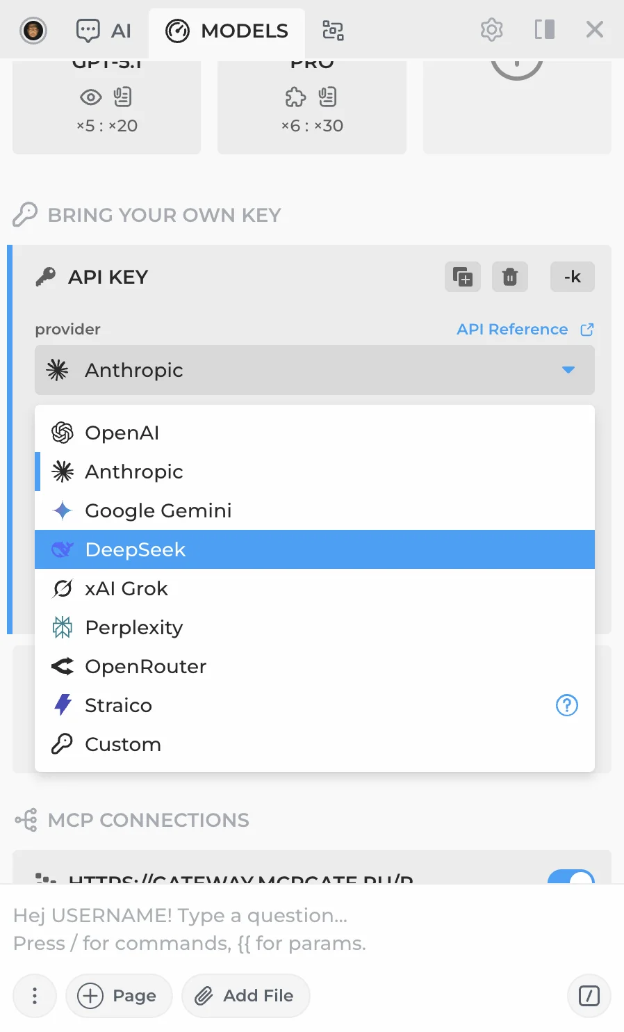 API connections let you bring your own API key from OpenAI, Anthropic, Google Gemini, DeepSeek, xAI Grok, Perplexity, OpenRouter, Straico, or any OpenAI-compatible provider — including local models via Ollama.