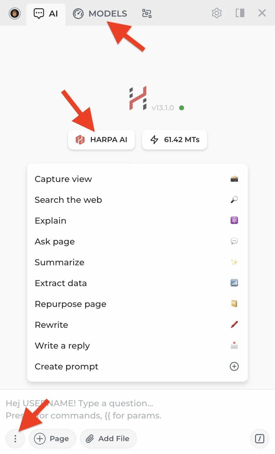 Open HARPA on any website by clicking its icon or pressing Alt+A (Windows) or ^+A (Mac).