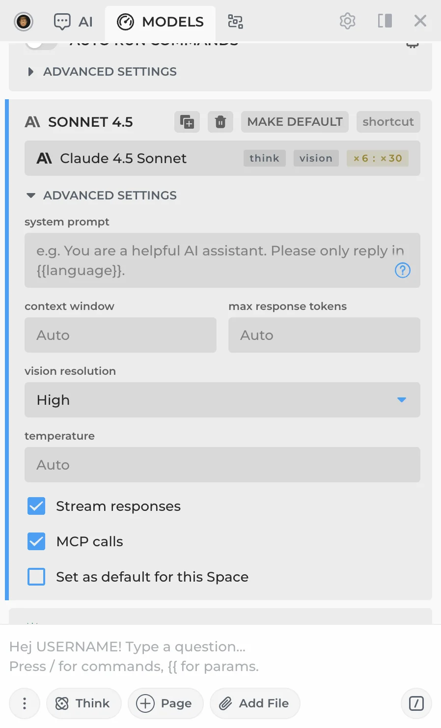 Open the AI model menu by clicking the MODELS tab at the top or the three-dot menu in the bottom left corner.