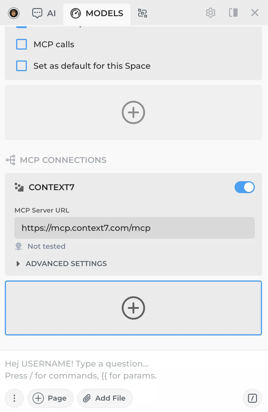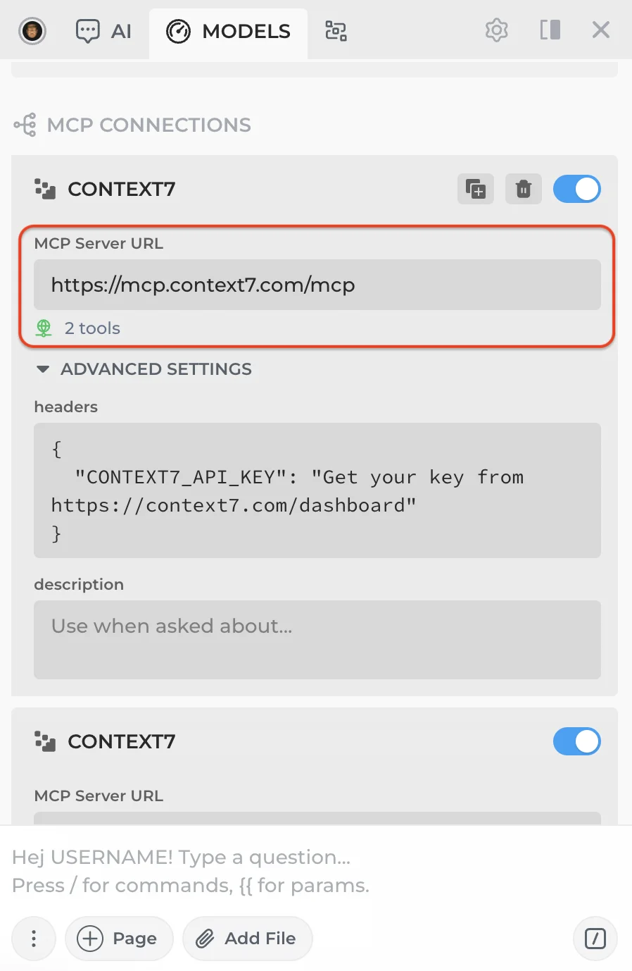 You'll see a sample Context7 MCP connection included for reference. If you'd like to use it, create your own API key at Context7.