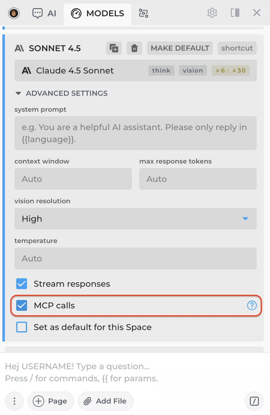 To verify that your connection receives MCP tools, find it in the expanded model menu (click MORE) and check the MCP calls toggle at the bottom. This doesn't guarantee full MCP compatibility, but it will send tool definitions along with your requests so you can test whether the connection works.